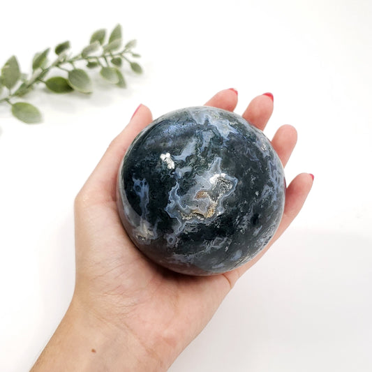 Green Moss Druzy Agate Sphere with Blue Chalcedony for Calm and Renewal