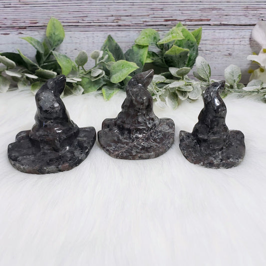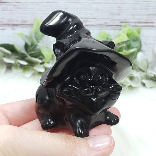 Black Obsidian Black Cat in Witch Hat – Protective Halloween Crystal Décor