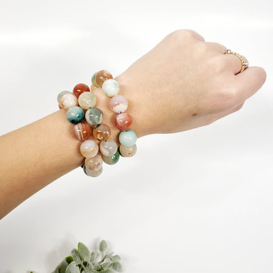 10mm Green Moss Agate Bracelet with Chalcedony – Optional Pink Flower