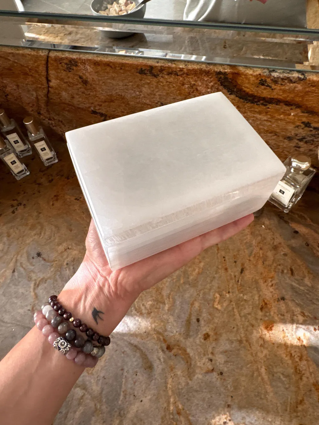 This large Moroccan Selenite Charging Box is designed for daily use—holding bracelets, rings, and meaningful items while bringing a clean, refined feel to your space.