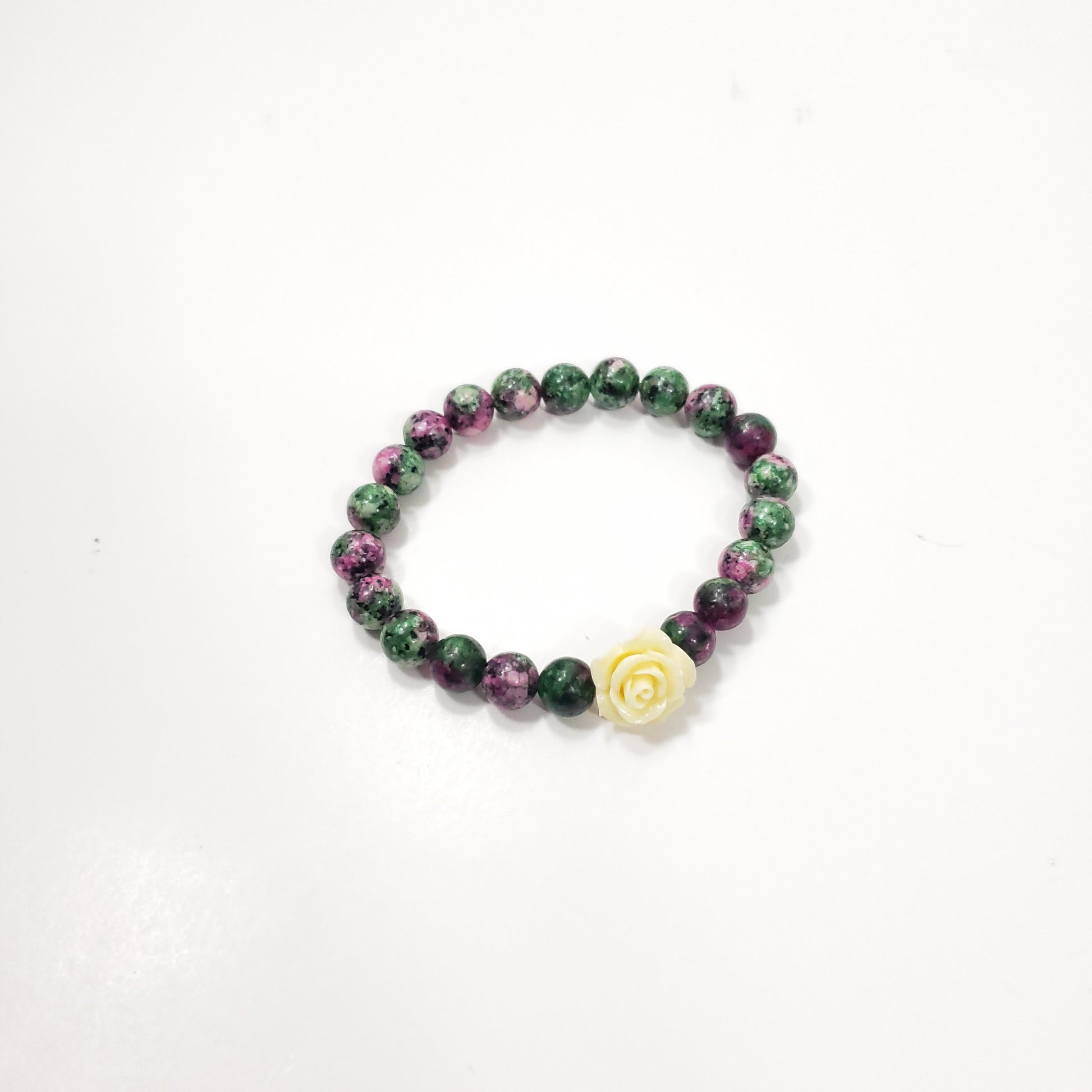 This Ruby Zoisite Crystal Bracelet with 15mm Reconstituted Stone Flower Focal Bead uniquely combines natural beauty and healing properties. The rich green hues of the ruby zoisite beads are complemented by the intricate details of the stone flower, creating a stunning and eye-catching design.